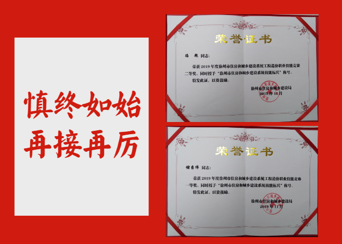 恭賀! 我所儲召偉、馮艷同志榮獲2019年徐州市住房城鄉(xiāng)建設(shè)系統(tǒng)工程造價職業(yè)技能競賽“一等獎”,并被授予“徐州市住房和城鄉(xiāng)建設(shè)系統(tǒng)技能標(biāo)兵”稱號